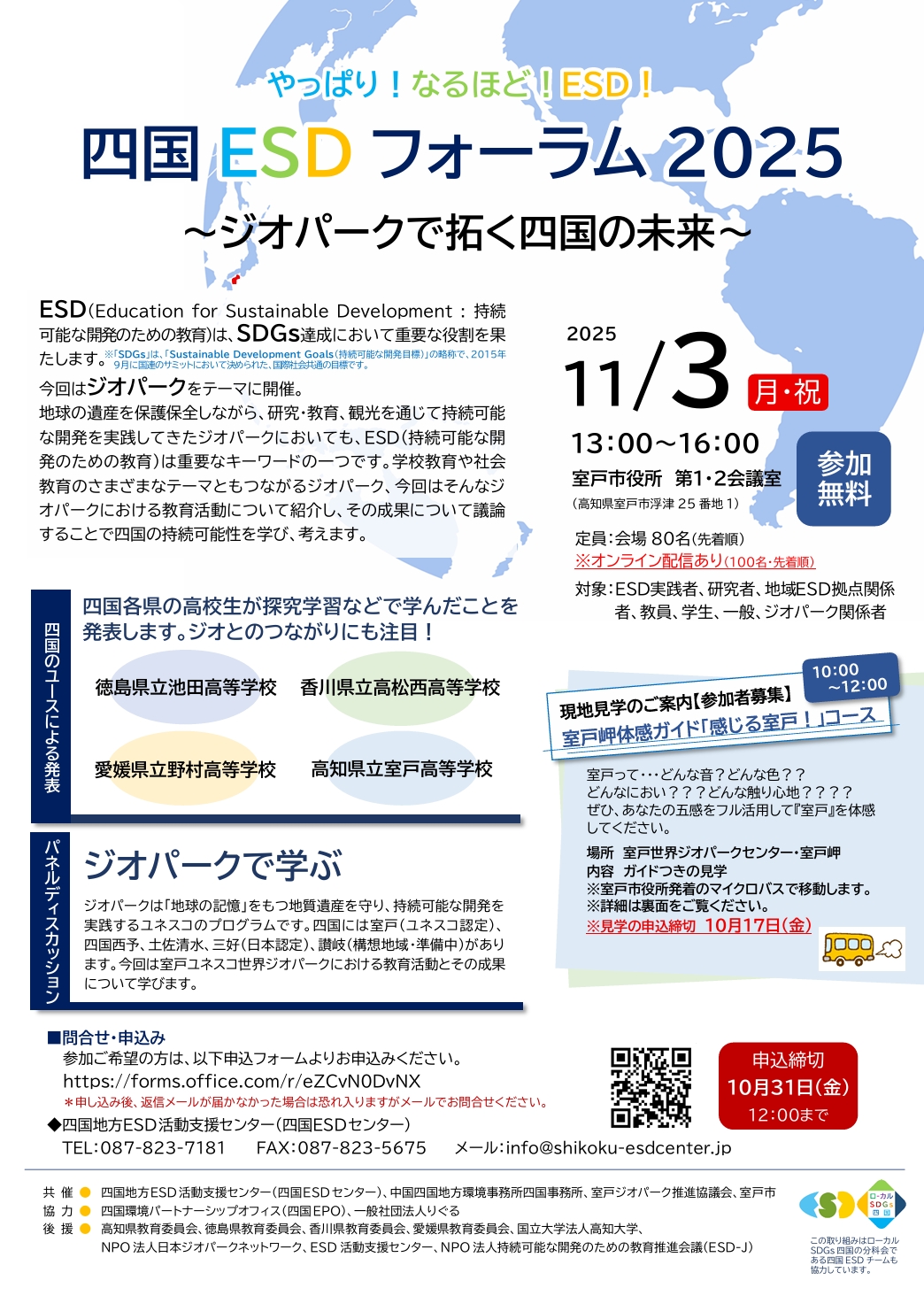 学校教育や社会教育のさまざまなテーマともつながるジオパーク、今回はそんなジオパークにおける教育活動について紹介し、その成果について議論することで四国の持続可能性を学び、考えます。